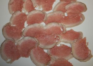Cortar en láminas lo más finas posible. Si tenéis cortadora de fiambre genial, sino utilizar un cuchillo bien afilado.