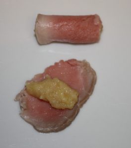 Envolver en film y al congelador. Se congela para que podamos cortarlo en láminas muy finas.