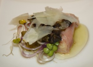 Montar el plato colocando unos rollitos, unos ligeramente encima de otros, regar con la vinagreta y terminar con unos brotes de rabanitos, unas lascas de queso y unas escamas de sal Maldom.