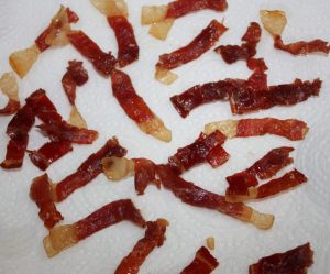 Aprovechando el aceite donde hemos confitado las alcachofas, freír tiras de jamón. Cortamos las cortadas en finas tiras y las añadimos a la sartén con el aceite bien caliente. Un par de minutos y escurrir sobre papel de cocina.