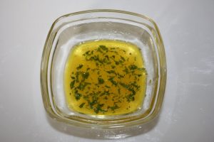 Hacer una vinagreta con las 4 cucharadas de AOVE, 2 de vinagre de sidra, el zumo de la naranja, una pizca de sal y el perejil picado.