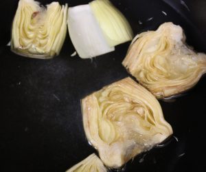 Poner en una sartén con aceite de oliva 0,4º, que las cubra. Comenzar con el aceite frío y después subir pero no demasiado, que quede a temperatura media. 10 minutos. Reservar los corazones de alcachofa.