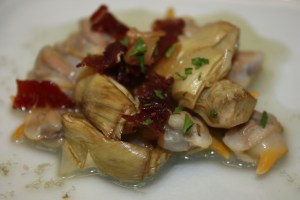 Ya solo nos queda rematar el plato. Calentar en una sartén los berberechos y alcachofas, con el jugo que han soltado los berberechos y la salsa que hemos hecho con las alcachofas y cebollino.