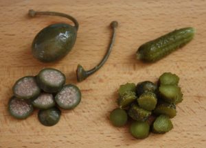 Cortar en rodajas los caparrones y los pepinillos.
