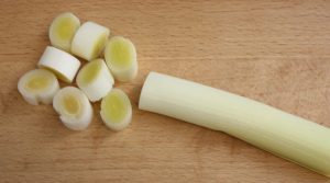 Ya solo nos queda confitar los puerros. Pelarlos y cortarlos en rodajas de 1 cm.