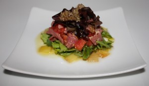 Colocar en la base del plato unos puerros. Encima hojas de lechuga verdes y sobre ellas la mezcla de pato, tomate y mostaza. Para terminar poner unas hojas de lechuga moradas y regar con la vinagreta.