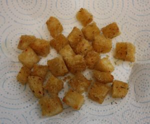 Lo mejor es utilizar una barra de pan del día anterior. Quitar la corteza y cortar la miga en daditos. Si la miga no está dura se nos deshará y será difícil cortarla.