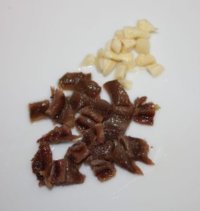 Cuando este bien ligada la salsa, añadir el ajo troceado y las anchoas troceadas. Volver a triturar hasta conseguir una salsa homogénea.