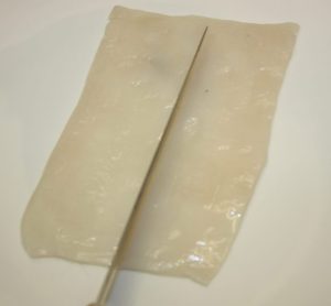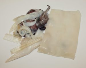 Quitar la piel del calamar y las patas. Cortar el saco del cefalópodo formando un rectángulo.