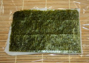 Sobre una esterilla de bambú poner un trozo de film y encima el rectángulo de calamar con los cortes hacia abajo, y sobre él, un alga nori del mismo tamaño que el rectángulo de calamar. Enrollar con ayuda de la esterilla y cortar en finas rodajas.