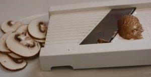 Limpiar las setas con un paño húmedo o un cepillito ( es muy práctico utilizar un cepillo de dientes. Dejarlo en la cocina y utilizarlo para este uso. Al principio cuando esté nuevo no presionar mucho para no romper la seta ). Eliminar la base del tallo. Si tenéis mandolina cortar con ella finas láminas, en caso contrario con un cuchillo bien afilado.