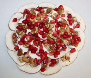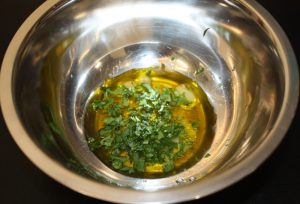 Hacer una vinagreta con el aceite, zumo de limón, jugo de granada, cilantro picado y sal.