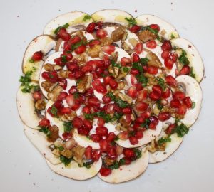 Pelar una granada. Reservar el jugo que suelta, lo vamos a utilizar para la vinagreta. Colocar dos cucharadas sobre el champiñón.