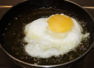 Calentar y cuando esté bien caliente pero sin llegar a humear, poner el huevo. Se puede cascar en el borde de la sartén o sobre el banco de la cocina y añadir directamente a la sartén, o poner en un cuenco o vaso para asegurarnos que al añadirlo a la sartén no esté roto.