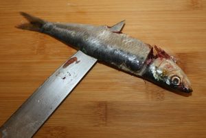 Con la punta del cuchillo hacer un corte en la parte de abajo, más o menos de la mitad hacia la cabeza y extraer las tripas. Lavar.