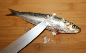 Desescamar el pescado. Si no tenéis desescamador utilizar un cuchillo y raspar con cuidado para no romper la piel, de la cola hacia la cabeza.