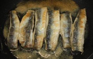 En una sartén con el aceite bien caliente poner las sardinas con la piel hacia abajo. Dorar y dar la vuelta.