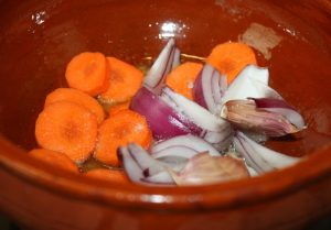 Poner la cazuela a fuego medio y añadir la zanahoria en rodajas, la cebolla a gajos pequeños y los ajos con piel a los que les habremos dado un corte por la mitad pero sin cortar del todo. Poner una pizca de sal. 5 minutos moviendo de vez en cuando.