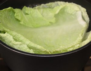 Forrar con las hojas de col de manera que cubra bien la base y los bordes y sobresalga por fuera del cuenco, ya que tiene que cubrir la carne por arriba.