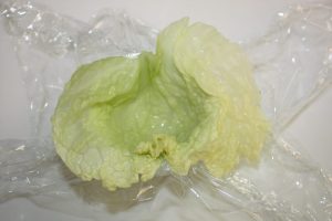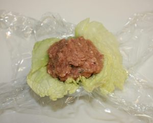 Doblar la col sobre la carne. Si no queda bien cubierta por arriba, no pasa nada, añadir en la parte superior un trozo de col de manera que toda la carne quede bien cubierta por col.