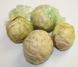 - Con la col haremos lo siguiente: quitar 4 hojas enteras, con cuidado de que no se rompan, una para hacer cada pelota, y añadir el resto a la olla