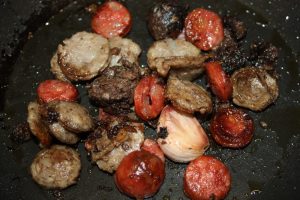 En otra sartén, también con aceite, sal y un ajo, dorar el blanquet, morcilla y chorizo a rodajas.