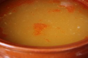 En una cazuela honda de barro poner dos puñados de arroz por persona, una cucharadas de tomate frito, una rama de perejil y un chorrito de aceite de oliva 0,4º. Dar una vuelta y añadir el caldo caliente, que cubra bastante por encima el arroz ya que queremos un arroz muy caldoso.