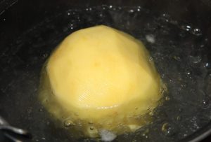 Cocer en un cazo con agua y una cucharadita de sal. El tiempo depende del tamaño de la patata. Pincharla y cuando el pincho entre con facilidad hasta el centro, sacarlas y escurrirlas.