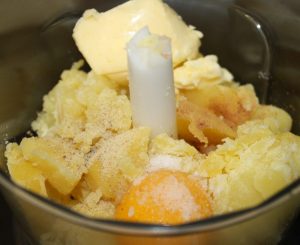 Triturar con la mantequilla, a temperatura ambiente, la yema, pimienta, nuez moscada y una pizca de sal.