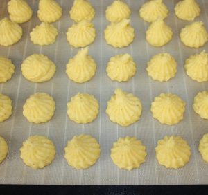 Sobre la rejilla del horno colocar una hoja de silicona, papel de horno o silpat. Hacer montoncitos de puré.