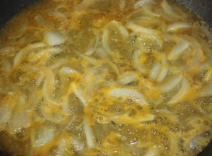 Pelar y cortar la cebolla en juliana. Añadir a la sartén en la que todavía nos queda aceite. Salpimentar. 5 minutos a fuego medio, moviendo de vez en cuando para que no se nos dore demasiado. Añadir el zumo de naranja y una cucharadita de azúcar para contrarrestar la acidez. Dejar otros 5 minutos a fuego medio.