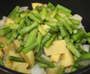 Cuando ya tengamos rehogada la cebolla y pera, añadir la patata y los espárragos reservados. 2 minutos.