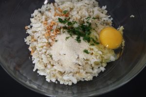 En un bol poner la patata, bacalao, ajo, 1 huevo, perejil picado y una cucharada de pan rallado. Sal no le vamos a poner ya que el bacalao, aunque esté desalado, ya le aporta bastante.