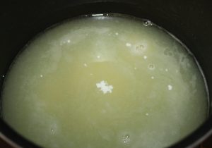 Poner a calentar en un cazo con el azúcar y la mantequilla.