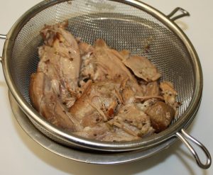 El cordero lo teníamos en la nevera cubierto con su caldo de cocción. Escurrir y reservar el caldo.
