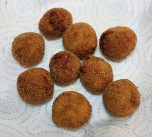 Cuando la masa esté fría y se pueda manipular, hacer bolitas. Pasar por huevo batido.