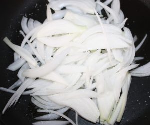 En otra sartén con otras dos cucharadas de aceite de oliva 0,4º, pochar la cebolla en juliana. Salar. Poner el fuego fuerte y cuando el aceite empiece a chisporrotear, bajar al mínimo. 10 minutos. Mover de vez en cuando.