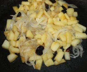 Incorporar a la sartén donde tenemos la cebolla pochada, la manzana y las pasas.