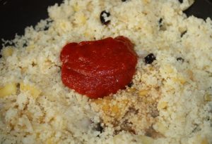 Añadir el cous cous. Dar una vuelta y…..momento de poner la salsa de tomate y la de soja.