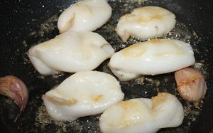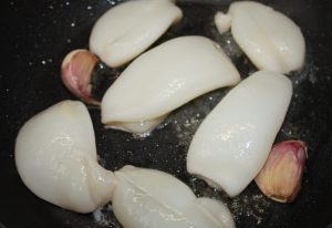 En otra sartén con 2 cucharadas de aceite, dorar los dos ajos, a los que previamente les habremos hecho un corte en el centro, a fuego fuerte. Añadir los calamares.