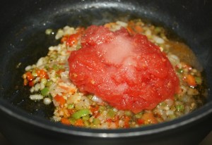 Añadir el tomate y una pizca de azúcar, como siempre que ponemos tomate fresco, para contrarrestar la acidez. Salpimentar.
