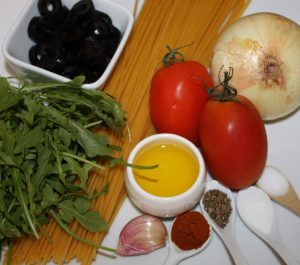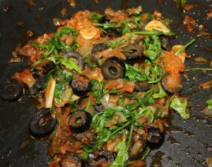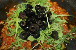 Ya solo nos queda añadir las aceitunas y la rúcula.