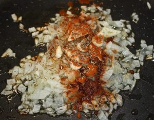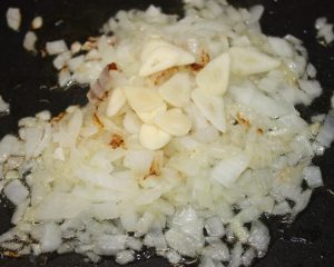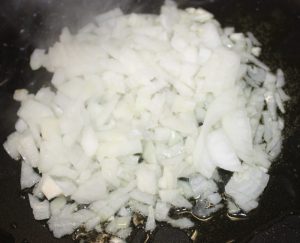 En una sartén con el aceite, dorar la cebolla. 5 minutos a fuego medio – bajo. Salar.