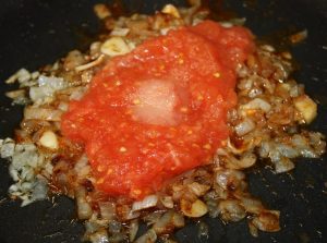 Momento de incorporar el tomate y el azúcar ( como siempre añadimos un poco de azúcar para contrarrestar la acidez del tomate natural ). Dejar 5 minutos a fuego medio. Probar de sal. Mover de vez en cuando para que no se queme.