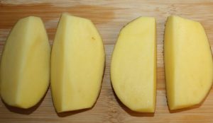 Primero comenzamos cortando la patata por la mitad. Si tienen alguna parte fea, eliminarla.