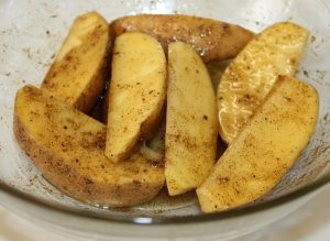 Poner en una fuente de horno con todo el aceite especiado y, meter en el horno junto con las alitas que ya llevarán unos 5-7 minutos.