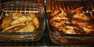 Sacar las alitas y patatas a los 20 minutos de haber puesto el pollo. Dar la vuelta a las alitas, mover las patatas, y volver a introducir en el horno 20 minutos.