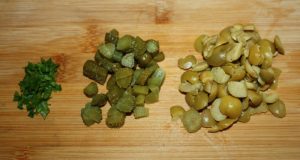 Trocear las aceitunas eliminando el hueso. También las podéis comparar sin hueso.