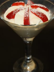 Encima de la espuma poner los fresones cortados en gajos o en daditos. Espolvorear con azúcar glas.