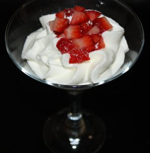 Poner un boquilla rizada, agitar y rellenar unas copas de Martini con la espuma ( utilizar las copas o boles que más os gusten ).